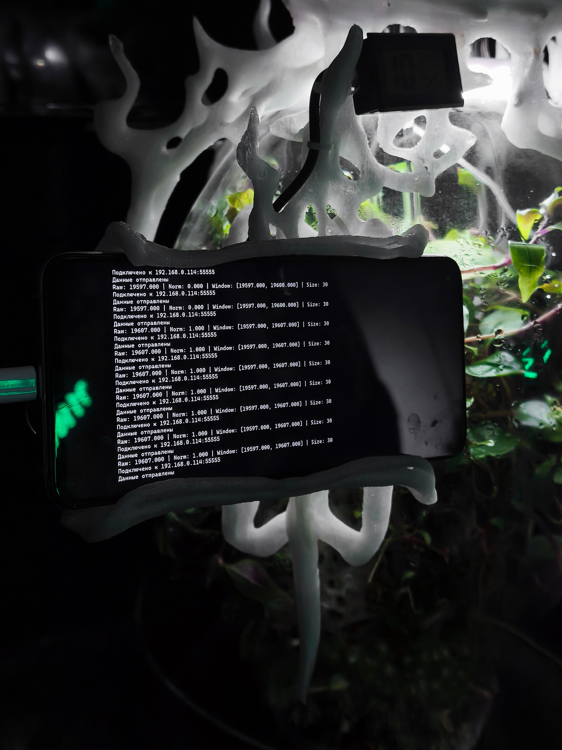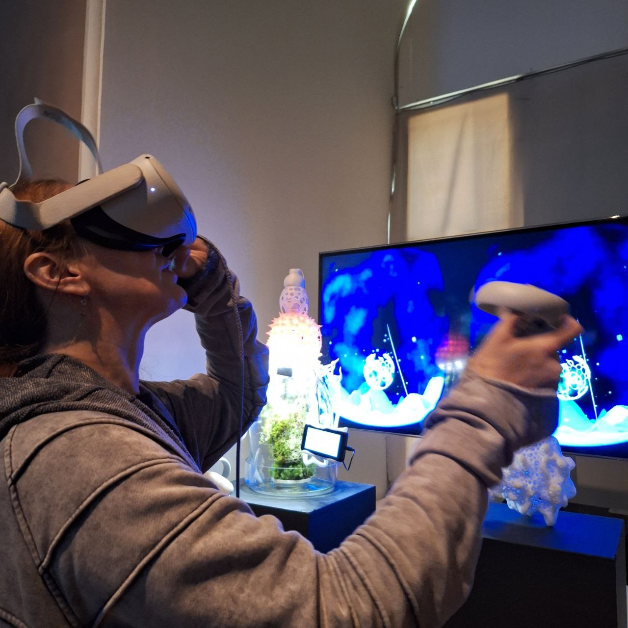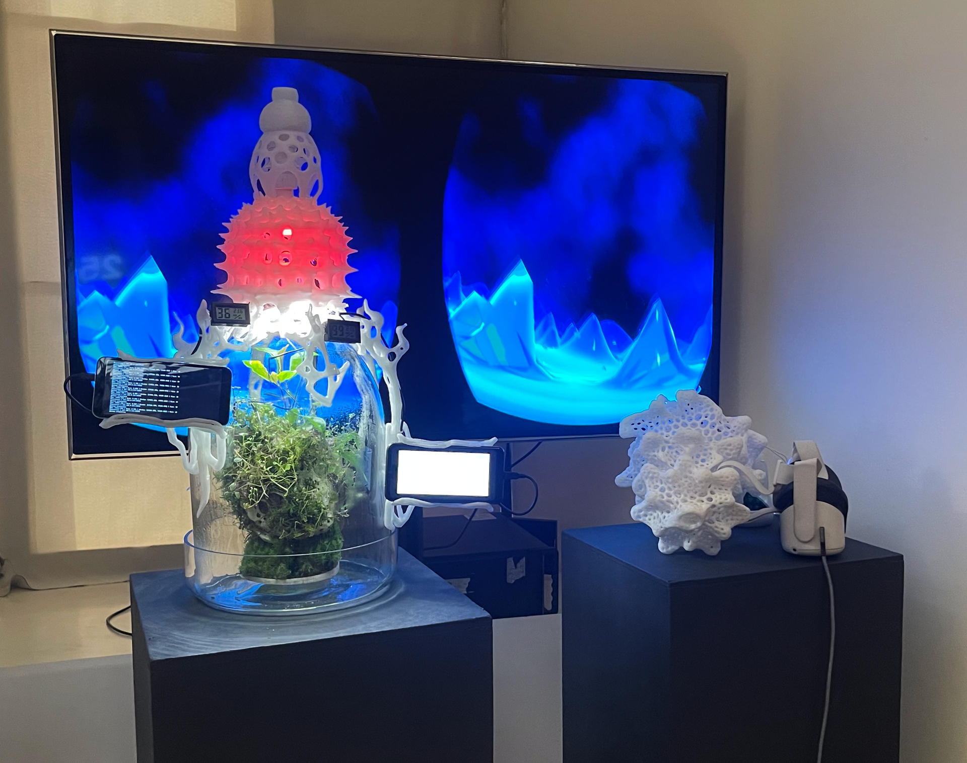 Проект переосмысляет технологии как мост между человеком и природой, предлагая модель взаимодействия, где технологии становятся языком межвидового диалога, а переработанные материалы — основой симбиотических связей. VR-аватар, лишенный хлорофилла, но наделённый «эмоциями», проводит в мир растительного сознания, раскрывая новые горизонты восприятия. Сенсор передает данные активности мхов в VR-приложение (Oculus), где аватар растения реагирует на действия пользователя изменением цвета, звуком и тактильной обратной связью. Это влияет на освещение, замыкая цикл взаимодействия, где переработанные материалы и технологии формируют язык межвидового диалога, а не доминирования.